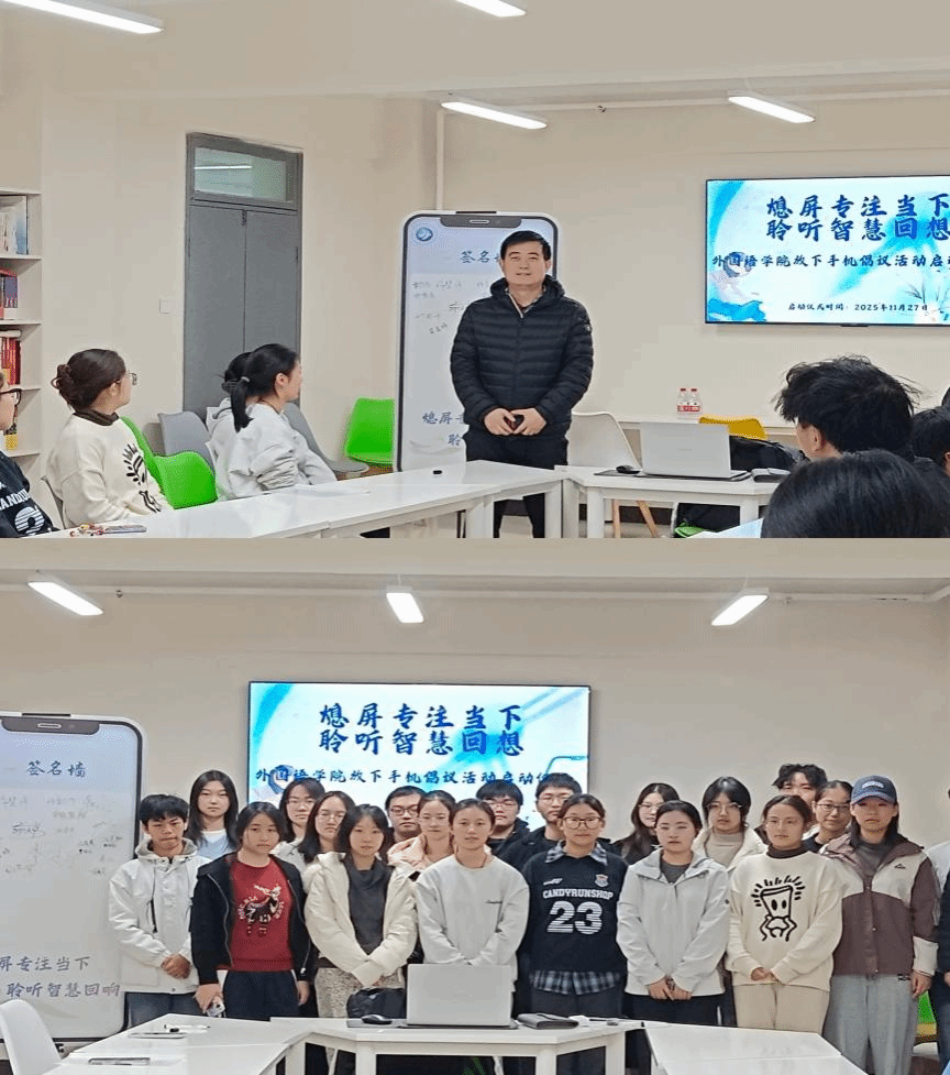 为加强学生自律能力培养,提升学生沉浸式思考与学习能力,学院在一站式社区举办“熄屏专注当下,聆听智慧回响——放下手机倡议活动”启动仪式,许涛涛老师及2025级英语专业学生参与活动。首先,许涛涛老师围绕“手机依赖对专业学习的影响”作阐释,强调专注对学习与思考能力提升的重要作用,并从“物理隔离干扰源、建立时间专注容器、明确手机使用目的”三方面给出实践指引。随后,学生代表霍思雨围绕“合理用机、作息调整、时间管理”三个方面发出倡议,并引导师生共同参与承诺签名。最后,同学们围绕“戒手机沉迷,强专业能力”召开了主题班会。通过此次活动,同学们深化了对合理使用手机认识,进一步增强了自律意识与专注学习的主动性,切实筑牢了“戒沉迷、强专业”的思想与行动根基。