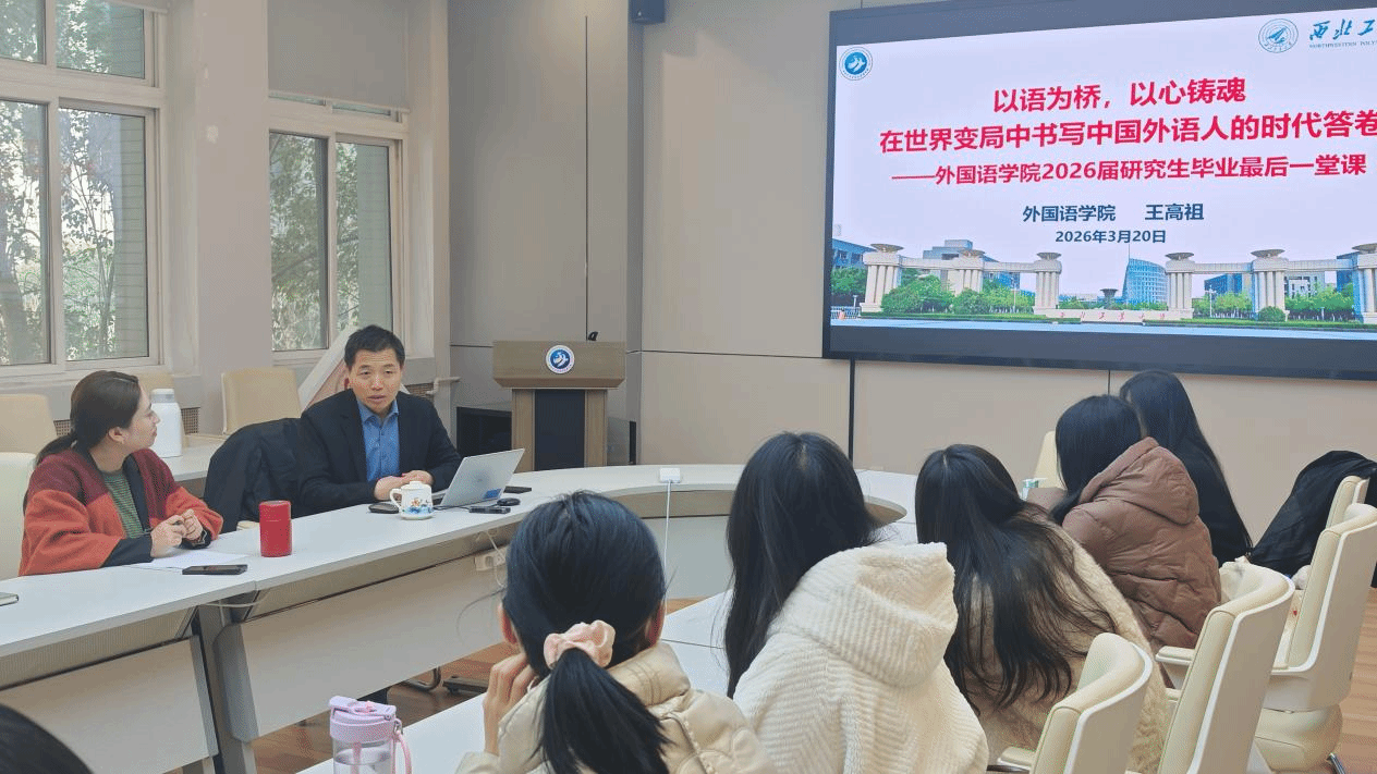 3月20日上午,外国语学院党委书记王高祖以“以语为桥,以心铸魂,在世界变局中书写中国外语人的时代答卷”为题向2026届硕士毕业生讲授“工大最后一课”,为即将告别校园、奔赴新征程的毕业生们指引方向、凝聚力量。讲座由院党委副书记张桑桑主持。