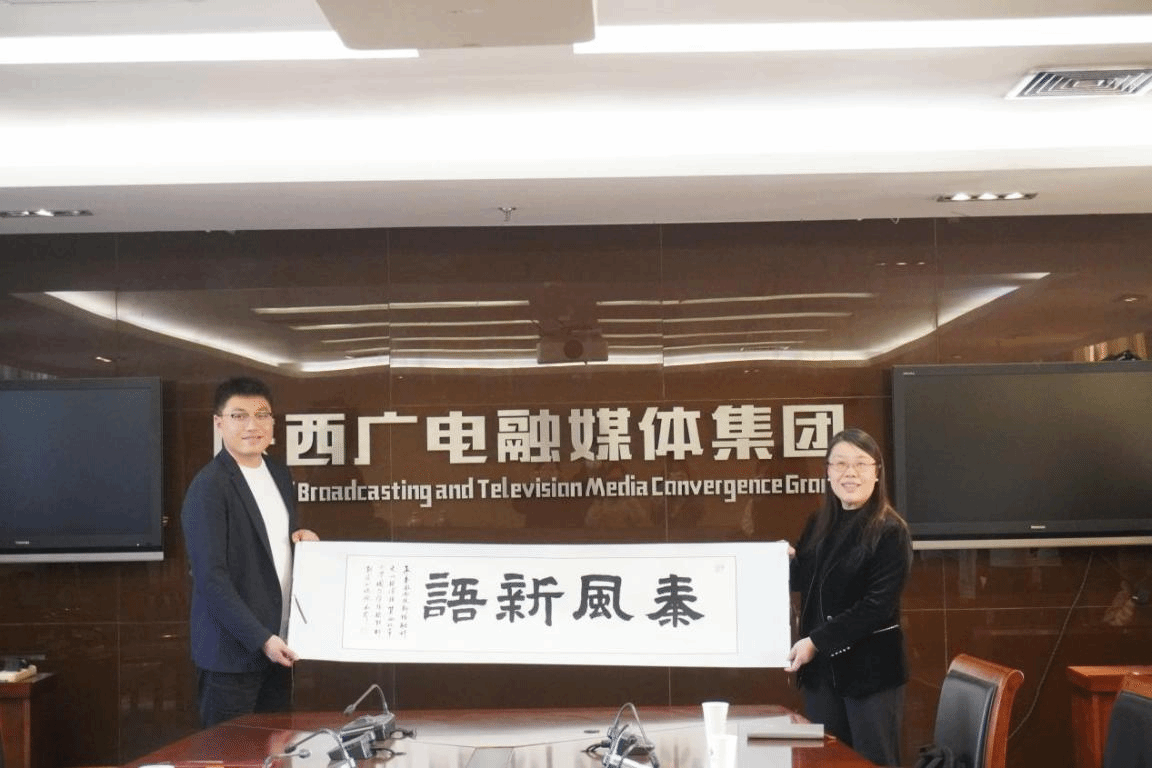 最后,孙瑜与范文共同打开“秦风新语”卷轴,标志着双方在校企协同育人、传播陕西文化、讲好中国故事方面正式拉开帷幕。“秦风新语”书法作品由我院副教授车向前亲笔书写。