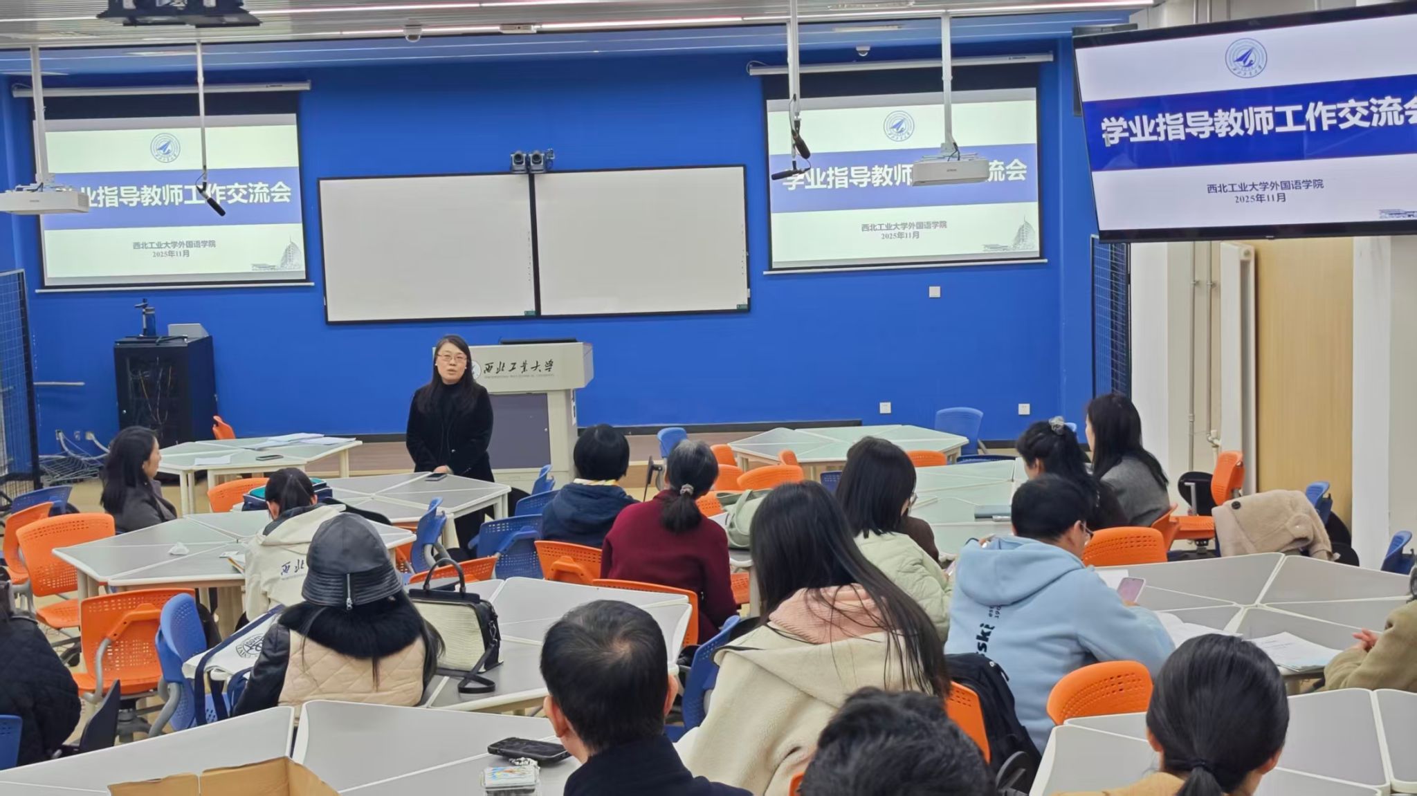 为深入贯彻落实学校“加快建设一流本科教育”的战略部署,持续优化学业指导机制,强化教师在人才培养中的主导作用,推进“总师育人文化”走深走实,外国语学院于11月25日中午在国际化社区组织召开2025级本科生与学业指导教师交流会。学院领导班子全体成员、学业指导教师及2025级全体本科生齐聚一堂,共话学业发展蓝图。