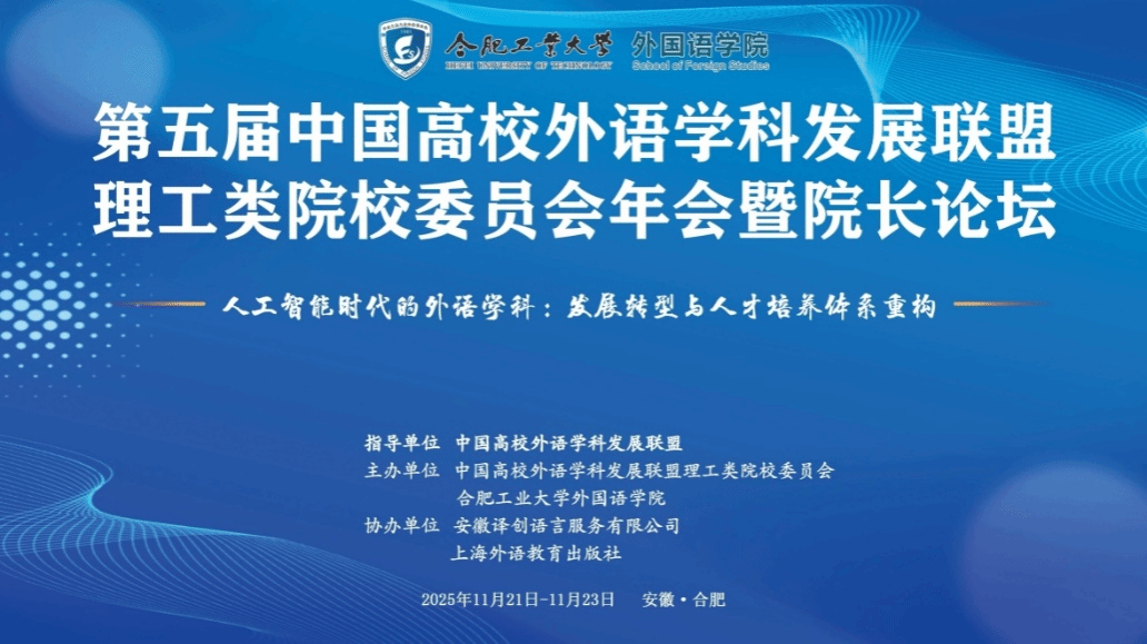 11月21—23日,第五届中国高校外语学科发展联盟理工类院校委员会年会暨院长论坛于合肥隆重启幕。本次盛会由中国高校外语学科发展联盟理工类院校委员会联合合肥工业大学外国语学院共同主办,汇聚了全国60余所理工类高校的80余位外语学院院长、系部负责人等学界骨干。我院孙瑜院长受邀出席第五届中国高校外语学科发展联盟理工类院校委员会年会暨院长论坛,以《人工智能时代的外语学科发展探索与实践》为题作主旨报告,与业界同仁共话外语学科建设与发展新路径。