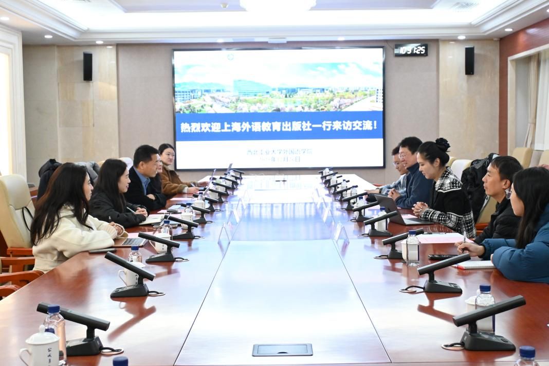 为进一步深化校社合作,推动外语教育教学改革,12月26日,上海外语教育出版社(以下简称“外教社”)副总编张宏、陕西中心主任徐惠一行赴外国语学院开展调研交流。学院党委书记王高祖,副院长周爽、王晓丹,党委副书记张桑桑及本科教学主管崔诗晴参加了本次调研。